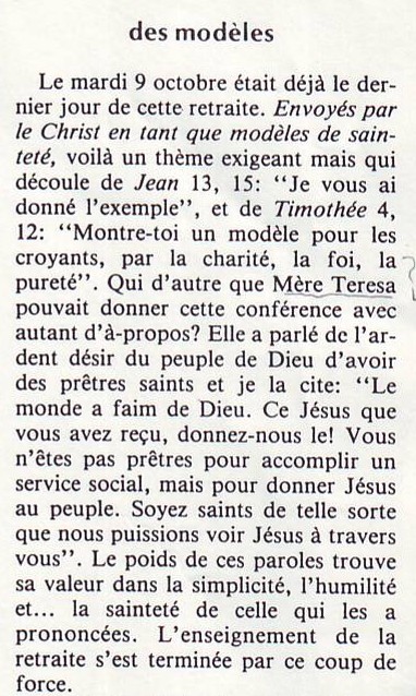 'Le mardi 9 octobre était déjà le dernier jour de cette retraite. Envoyés par le Christ en tant que modèles de sainteté, voilà un thème exigeant, mais qui découle de Jean 13,15 : "Je vous ai donné l'exemple", et de 1Tim 4,12 : "Montre-toi un modèle pour les croyants, par la charité, la foi, la pureté". Qui d'autre que Mère Térésa pouvait donner cette conférence avec autant d'à-propos. Elle a parlé de l'ardent désir du peuple de Dieu d'avoir des prêtres saints et je la cite : "Le monde a faim de Dieu. Ce Jésus que vous avez reçu, donnez-nous le! Vous n'êtes pas prêtres pour accomplir un service social, mais pour donner Jésus au peuple. Soyez saints de telle sorte que nous puissions voir Jésus à travers vous". Le poids de ces paroles trouve sa valeur dans la simplicité, l'humilité et... la sainteté de celle qui les a prononcées. L'enseignement de la retraite s'est terminé par ce coup de force.'