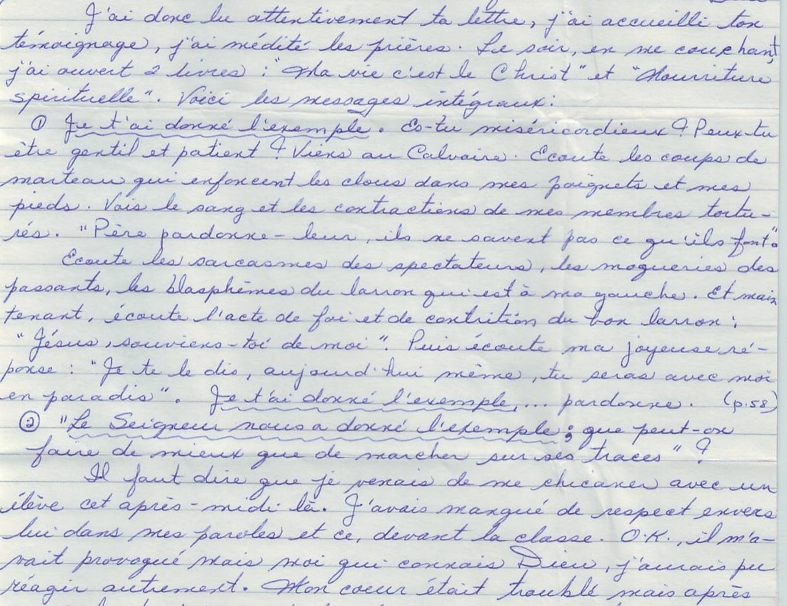 'Je veux te remercier sincèrement pour les prières que tu m'as envoyées, de même que pour cette partie de ton témoignage. Je lisais tout cela l'autre jour, et ça me parlait beaucoup. Surtout la prière où l'on dit que l'on abandonne "même votre réputation" (...) J'ai donc lu attentivement ta lettre, j'ai accueilli ton témoignage, j'ai médité les prières. Le soir, j'ai ouvert deux livres: ‘Ma vie, c'est le Christ’ et ‘Nourriture Spirituelle’. Voici les messages intégraux :